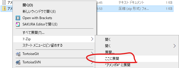 アメンボ.zipを右クリックし「7-Zip」>「ここに展開」をクリックします。