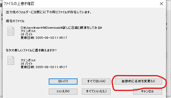 出力先に名前が同じのファイルが存在していると確認ダイアログが表示されます。今回は上書きさせないため「自動的に名前を変更」をクリックします。