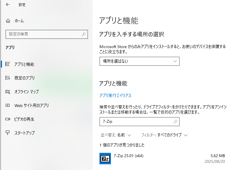 「設定 > アプリ > アプリと機能」からインストール済のアプリに「7-Zip」があれば無事にインストール成功です。