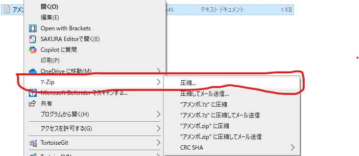 アメンボ.txtを右クリックし「7-Zip」>「圧縮」をクリックします。