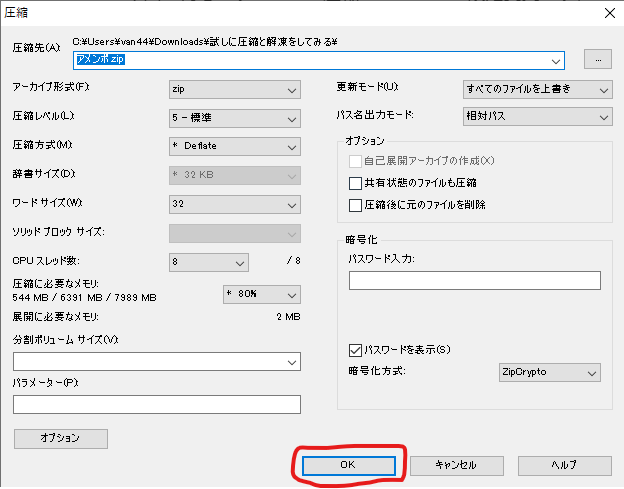 今回は何もせずそのまま圧縮したいので、設定変更せずに「OK」をクリックします。