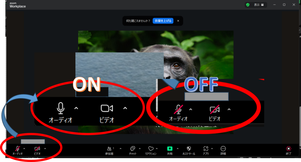 (自分以外が発言している場合は、雑音が入らないよう自分の音声はOFFにする等、場面に応じて使用する。)
