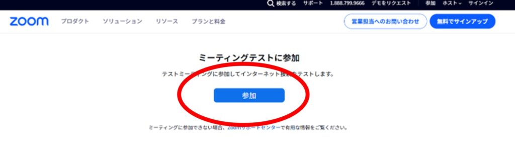 1. Zoomテストミーティングにアクセスし、「参加」をクリック。