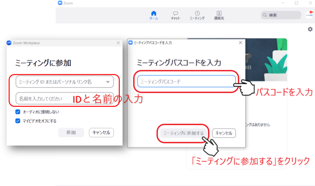 ※URLが添付されていれば、そこから飛ぶ事も可能。 - 主催者の「ミーティングID(11桁)」と自分の「名前」を入力し、参加をクリック。