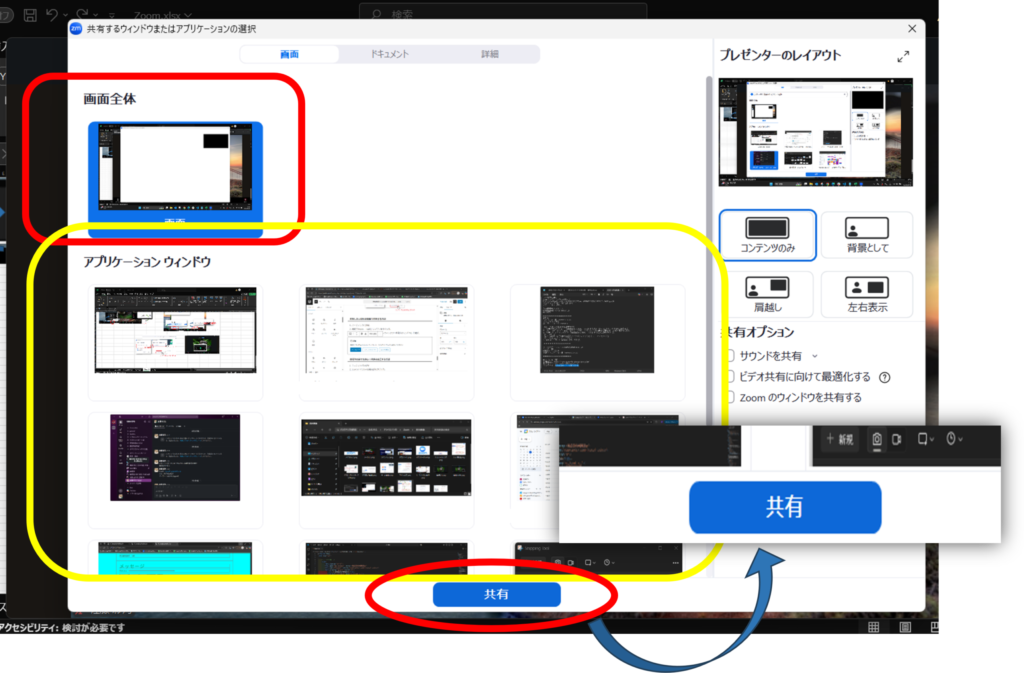 - 「画面全体」か、「アプリケーションウィンドウ」から指定のウィンドウを選択し、「共有」をクリック。
