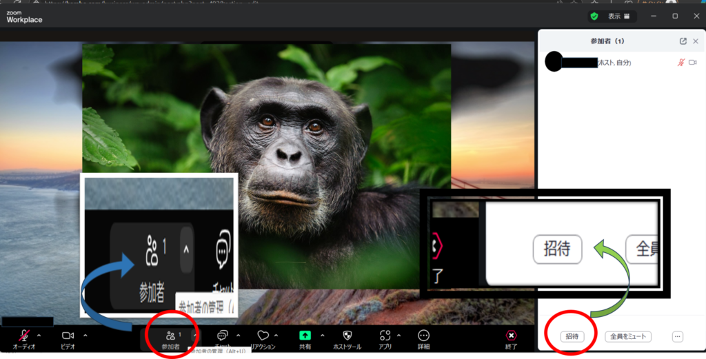 - 画面下の「参加者」アイコンを選択すると、右側に参加者リストが表示され、その下に「招待」の項目が追加される。