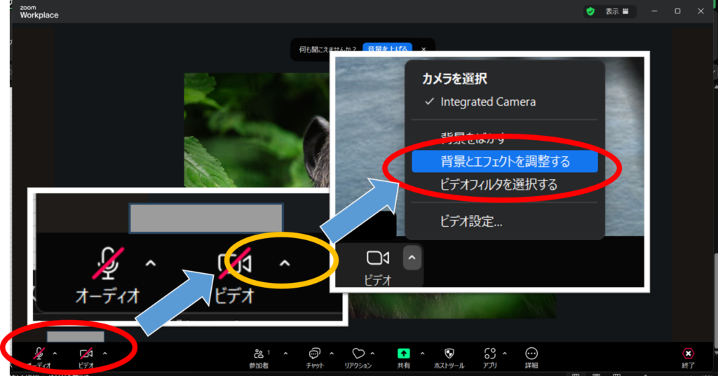 - 「背景とエフェクトを調整する」をクリックし、バーチャル背景より背景画像をクリックすれば、背景の加工は完了。
