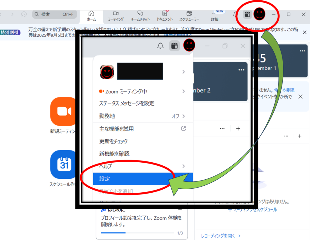 ・スピーカーとマイクの設定はホーム画面の右上にある自分のアイコンから「設定」を開く。