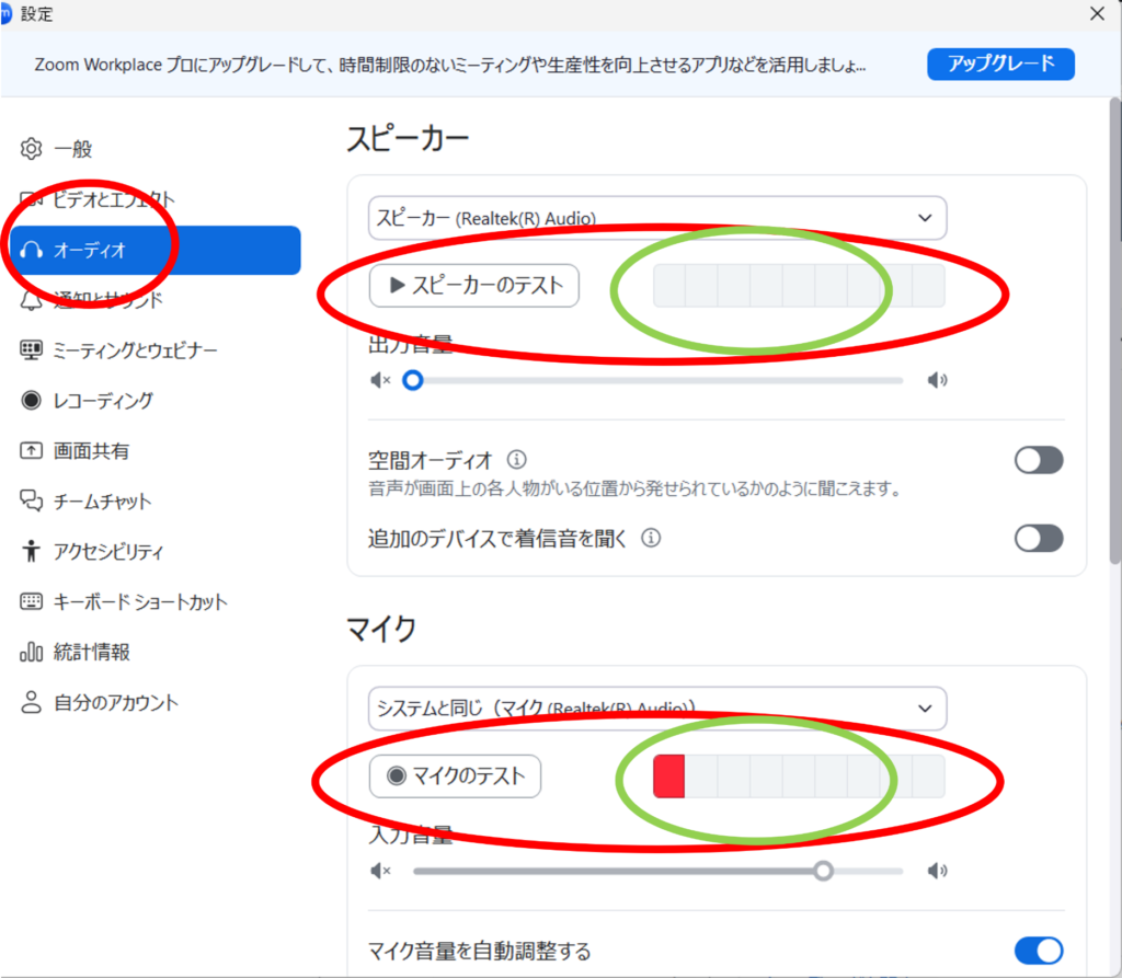 (正常に動いている場合、声を出してみるとマイクの「入力レベルバー」が緑色になる。)