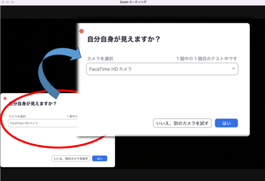(問題が無ければ「はい」を、問題があれば「いいえ」を選択し、別のカメラやマイクで再度テストを行う。)