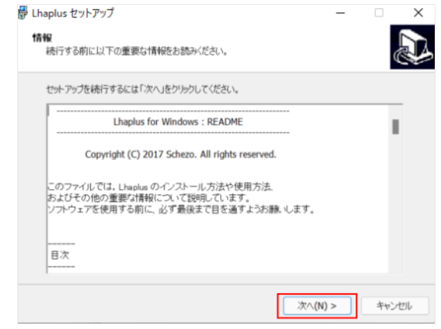 ダウンロードしたインストーラ(.exeファイル)をダブルクリックし、インストールウィザードの案内に従って進める。インストール後は自動的にLhaplusが起動し、初期設定画面が開く。