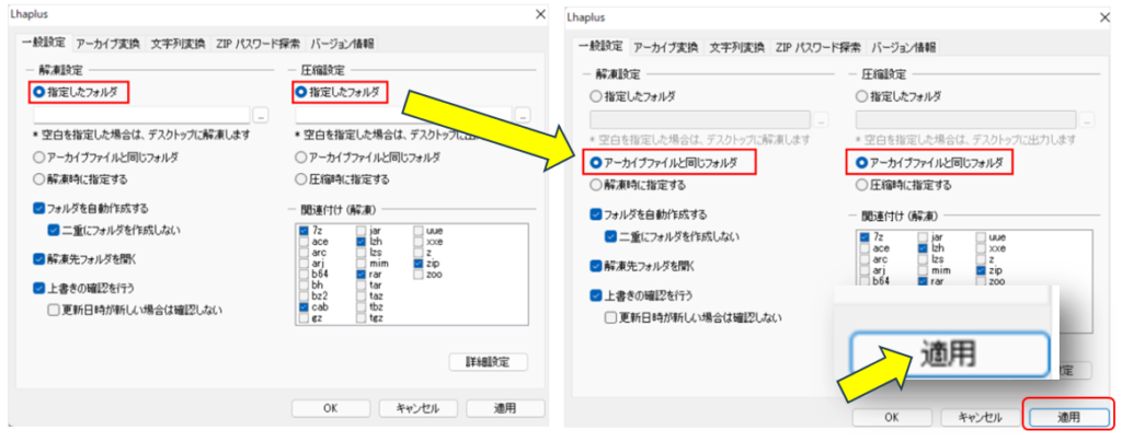 Lhaplusのアイコンをダブルクリックし、赤枠2カ所「指定したフォルダ」の項目を、「アーカイブファイルと同じフォルダ」項目に変更して、「適用」をクリック。